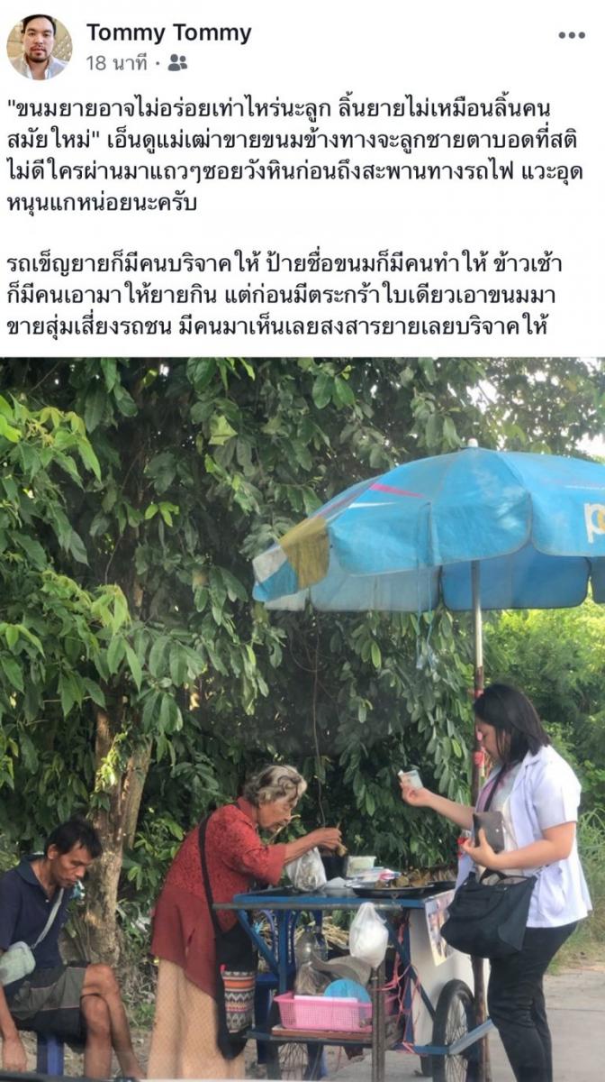 เป็นเรื่องราวที่ดีอยากช่วยแชร์ให้ชาวโซเชียล โดยโพสต์ผ่านเฟสบุ๊ค Tommy Tommy หากใครได้ผ่านไปแถวนั้นอุดหนุนขนมยายหน่อยนะ ยายขายขนมไส้ขนมเทียน และข้าวต้มมัดเป็นต้น เมื่อก่อนยายต้องเดินขายขนมโดยมีแค่ตระก้าเพียงใบเดียว กับลูกชายที่ตาบอดสติก็ไม่ดี ต่อมาได้มีคนใจดีบริจาครถเข็นให้ยายและป้ายชื่อก็มีคนให้ ยายจะจอดขายอยู่บริเวณแถวๆซอยวังหิน จ.ชลบุรี แวะอุดหนุนแกหน่อยนะครับ
