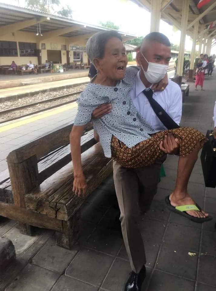 เพจเฟสได้ออกมาเผยภาพสุดน่ารักของนักเรียนตำรวจนายสิบนายหนึ่ง ขณะอยู่ในชานชาลารถไฟ แต่เขาหันไปเห็น คุณยายท่านหนึ่งเดินขึ้นรถไฟไม่ไหว จึงเข้าช่วยเหลือด้วยการอุ้มคุณยายไปนั่งบนรถไฟด้วยตัวเอง