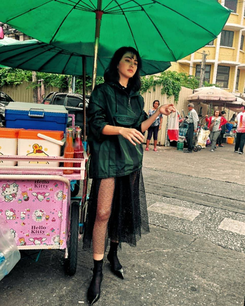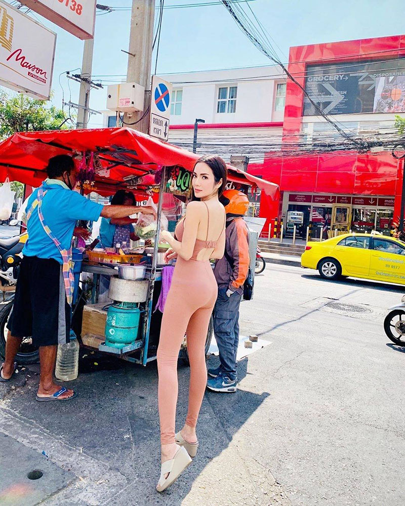 接下来这位可不是一般人,她买路边摊也是经常被人看到呐,她就是高高在上的时尚界女王同时也是一位辣妈的Chompoo Araya啦,这次的她是在买泰式煎饼,同时穿着非常有个性的服装,还需要提到的是,Chompoo妈咪在随意性地po图方面可是不输给别人,看上去只是随便一拍发发,但是图片一出来,却十分酷呢,把她拍照的地址发出来吧,大家一起去打卡。