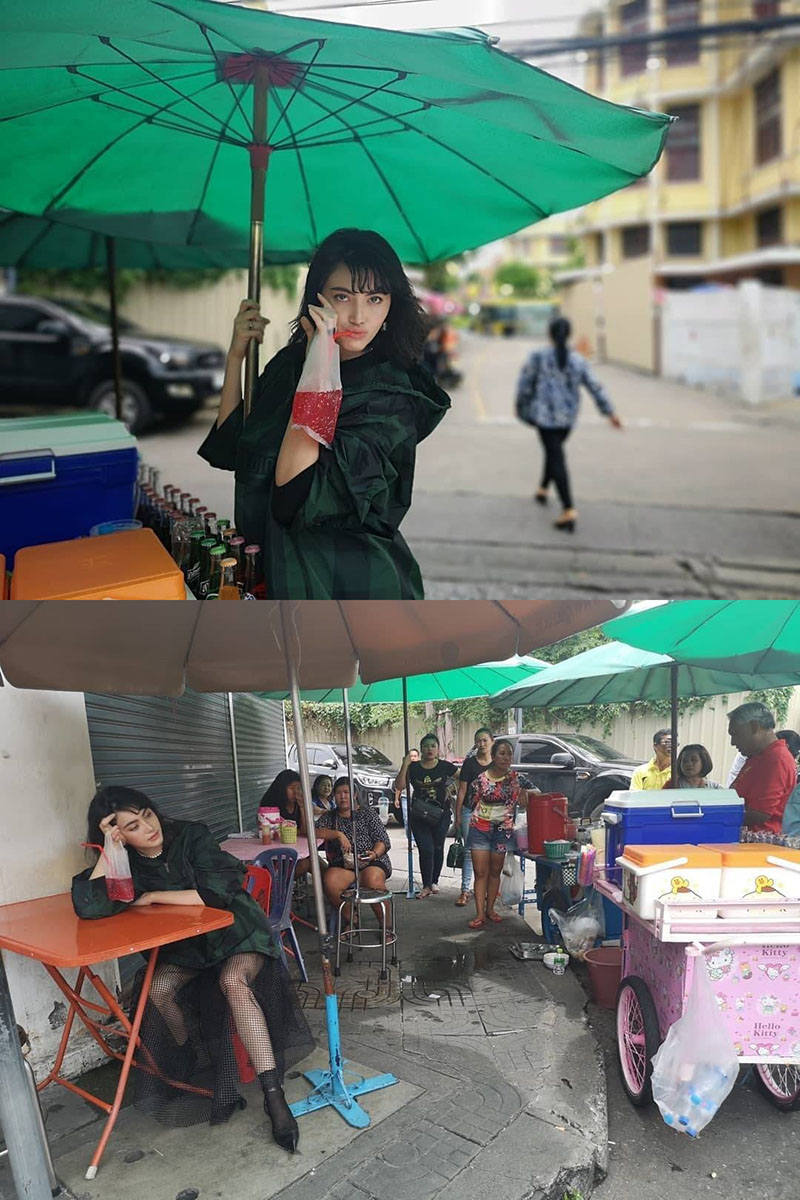 喝普通的红色糖水怎样才能喝出高级感,Mai Davika可以说给我们做了很好的示范,不仅仅是买路边的红色糖水,她还坐到路边等着饭和汤端过来,是名副其实的身着华服却沉迷路边小摊了,如此随性,这样的她粉丝们不要太喜欢哦。