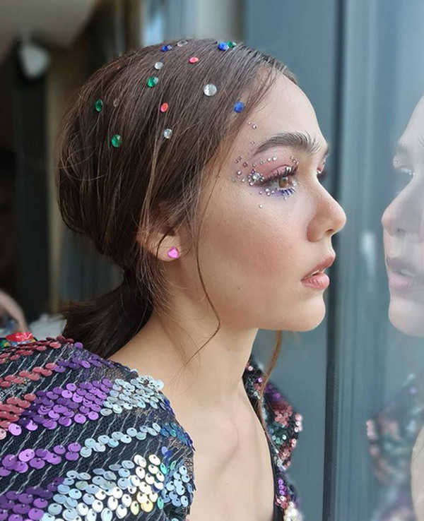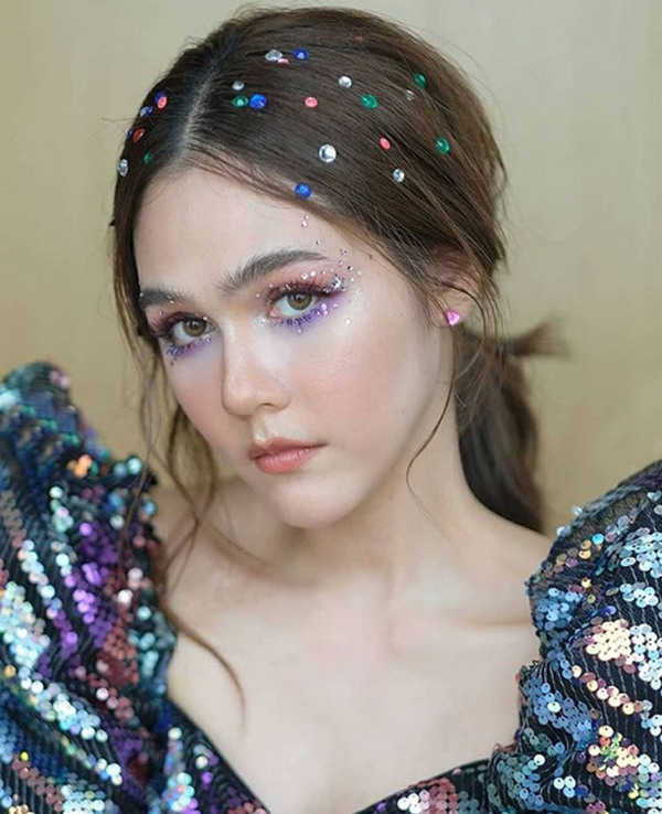 再来看看闪闪亮亮的亮片装扮吧,她的整体妆发都和眼周、眉毛和头发的亮片完美搭配,看起来非常高级,绝对的满分的合适,谁正在思考新年聚会上的装扮,这是一个不错的选择哦!