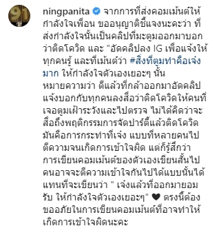 "จากการที่ส่งคอมเมนต์ให้กำลังใจเพื่อน ขออนุญาตชี้แจงนะคะว่า ที่ส่งกำลังใจนั้นเป็นคลิปที่มะตูมออกมาบอกว่าติดโควิด และอัดคลิปลง IG เพื่อแจ้งให้ทุกคนรู้ และที่เมนต์ว่า #สิ่งที่ตูมทำคือเจ๋งมาก ให้กำลังใจตัวเองเยอะๆ นั้นหมายความว่า ดีแล้วที่กล้าออกมาอัดคลิปแจ้งบอกกับทุกคนลงสื่อว่าติดโควิดให้คนที่เจอตูมเฝ้าระวังและไปตรวจ"