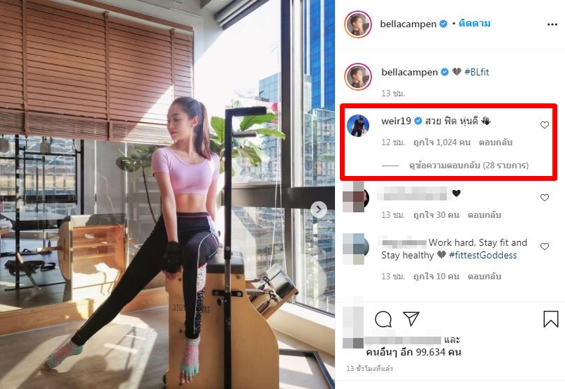 ล่าสุดคู่นี้ก็มีโมเมนต์ฟินมากออกสื่ออีกครั้งเมื่อสาวเบลล่าได้โพสต์ภาพลงอินสตาแกรมและหนุ่มเวียร์ก็ได้เข้ามาคอมเมนต์ ที่เรียกว่าเล่นใหญ่ไม่ใช่น้อย โดยสาวเบลล่าได้โพสต์ภาพและแคปชั่นว่า “ #BLfit” ซึ่งหนุ่มเวียร์ก็เข้ามาคอมเมนต์ว่า “สวย ฟิต หุ่นดี ”