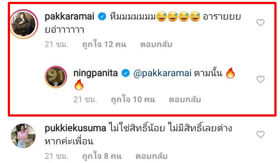 ซึ่งหลังจากที่ลงภาพนี้ไปสาวตองเองก็ได้เกิดอาการงงเลยเข้าคอมเมนต์ว่า “หืมมมมมมม อารายยยยอ่าาาาาา” โดยสาวหนิงเองก็ได้ตอบกลับไปว่า “ตามนั้น”