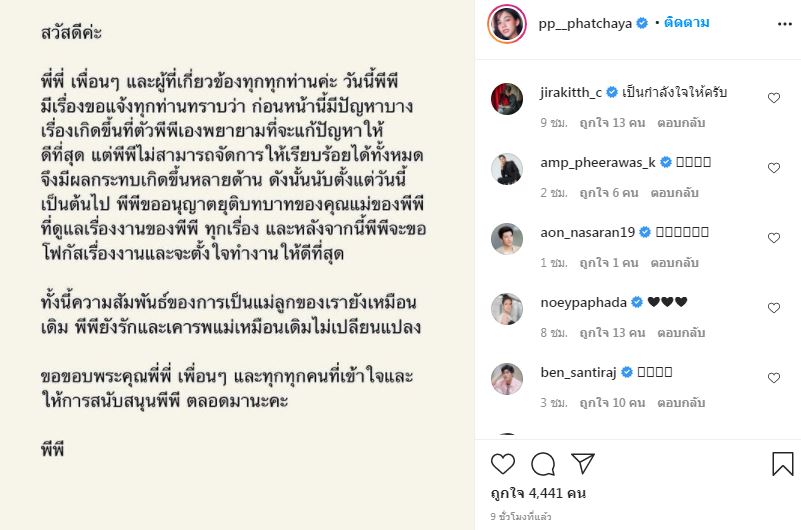 โดยสาวพีพีได้โพสต์ภาพเป็นตัวอักษรชี้แจงว่า “สวัสดีค่ะ พี่พี่ เพื่อนๆ และผู้ที่เกี่ยวข้องทุกทุกท่านค่ะ วันนี้พีพีมีเรื่องขอแจ้งทุกท่านทราบว่า ก่อนหน้านี้มีปัญหาบางเรื่องเกิดขึ้นที่ตัวพีพีเองพยายามที่จะแก้ปัญหาให้ดีที่สุด แต่พีพีไม่สามารถจัดการให้เรียบร้อยได้ทั้งหมดจึงมีผลกระทบเกิดขึ้นหลายด้าน ดังนั้นนับตั้งแต่วันนี้เป็นต้นไป พีพีขออนุญาตยุติบทบาทของคุณแม่ของพีพีที่ดูแลเรื่องงานของพีพี ทุกเรื่อง และหลังจากนี้พีพีจะขอโฟกัสเรื่องงานและจะตั้งใจทำงานให้ดีที่สุด ทั้งนี้ความสัมพันธ์ของการเป็นแม่ลูกของเรายังเหมือนเดิม พีพียังรักและเคารพแม่เหมือนเดิมไม่เปลี่ยนแปลงขอขอบพระคุณพี่พี่ เพื่อนๆ และทุกทุกคนที่เข้าใจและให้การสนับสนุนพีพี ตลอดมานะคะ #พีพี”