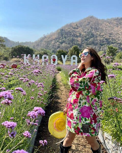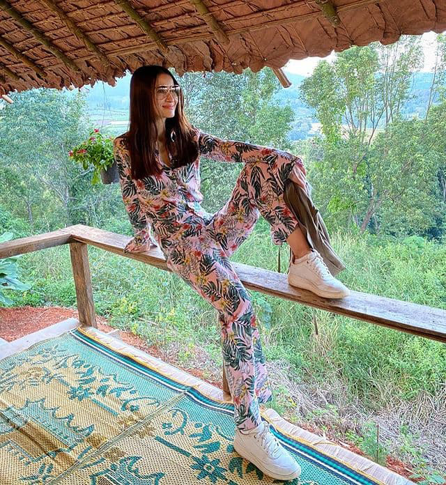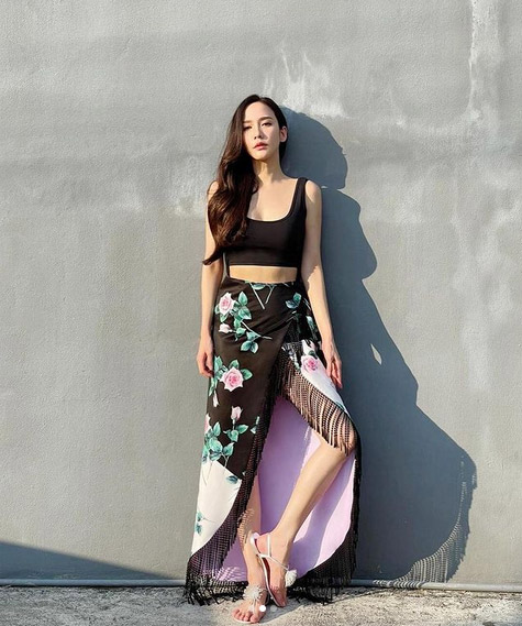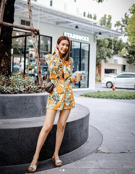 Mew Nittha 身穿一套深色调的热带风情套装,是另一种不同的美丽。