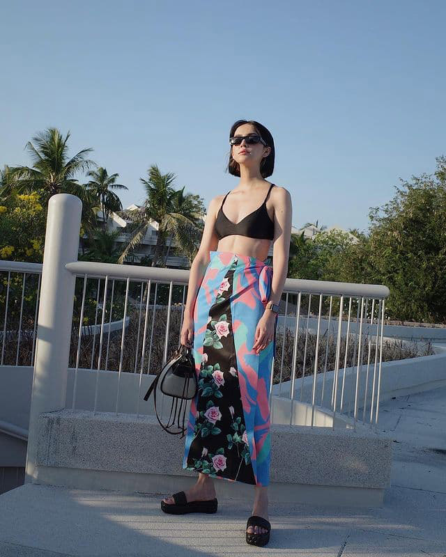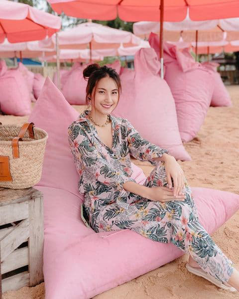 พลอย เฌอมาลย์ เลือกแมตช์บิกินี่สีชมพูกับกระโปรงป้ายลายพรินต์