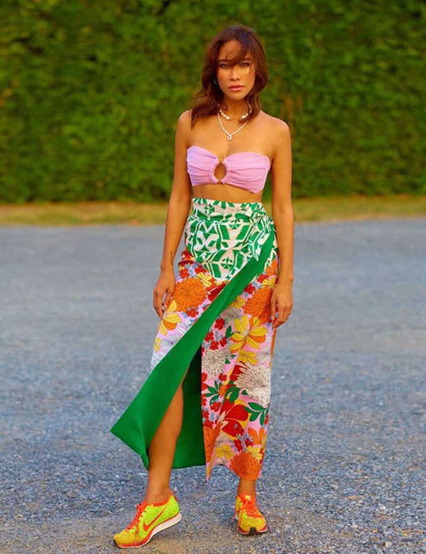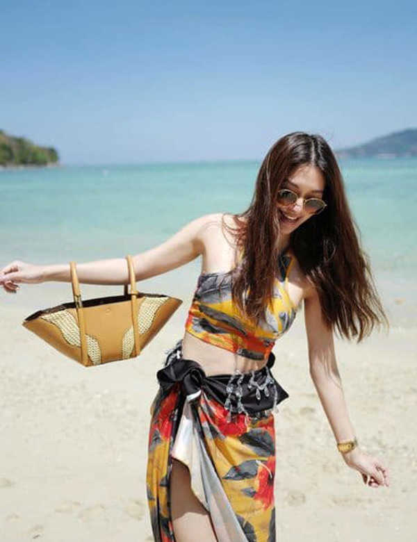 Ploy Chermarn 选择把粉红色的比基尼和有花纹的裙子混合在一起。