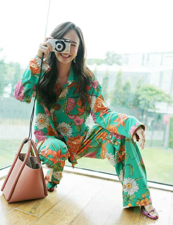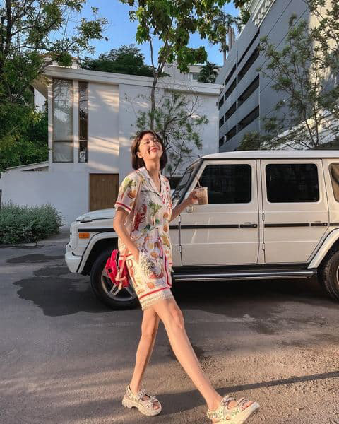 Chompoo Araya 非常清新,以一套古驰的印花套装迎接阳光的照射。