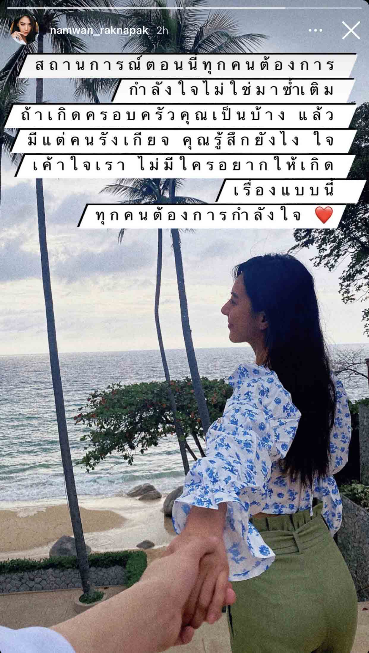 但尽管如此这场网络声讨似乎仍未平息,还有很多人在发声质疑她到底隔离了没有,于是 Namwan 专门发布了一则 Instagram Story:“现在大家与其指责我不如心平气和的发表意见,如果你的家人也经历了这种事被人人喊打,你会作何感想?将心比心,没人想卷入这样的非议,麻烦大家都冷静一下”。