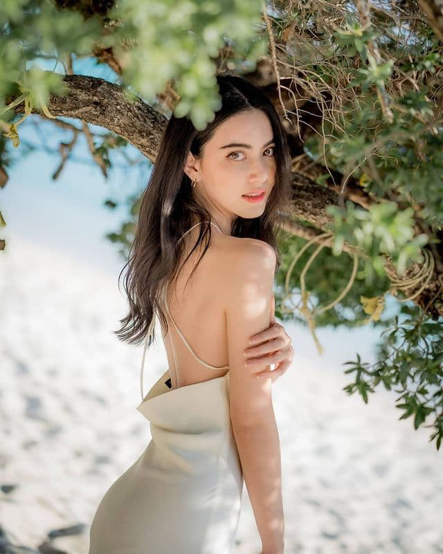 Mai Davika 选择了一条好看的露背长裙去海边