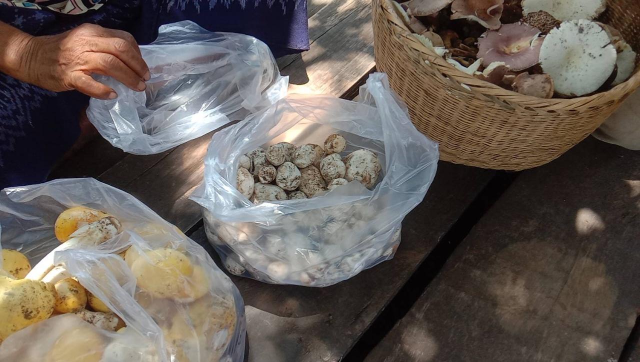 纳扬克拉克区的村庄旁,是沙艾县通往贴沙提县的路,车辆来来往往,不少人会停车买菌子。猜也蓬贴沙提县班莱和邦诺的山里会长各种菌子,如凤头菌、蜜蜂菌等。
