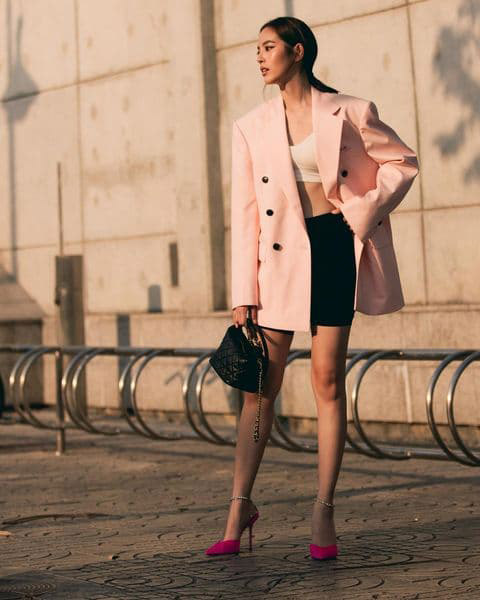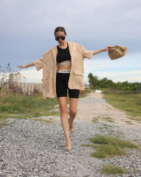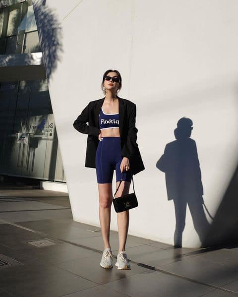 Bike Shorts x Blazer ถ้าอยากได้ลุคแคชชวล แต่ไม่ทางการมากไป แค่สวมกับเสื้อเบลเซอร์ตัวเก่ง คอมพลีตลุคด้วยส้นสูงหรือผ้าใบ ก็สามารถออกงานได้แล้ว