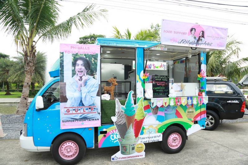 对“Gulf”来说这可是他的首部BG作品,包括泰国在内的7个国家的Big Gulf粉丝们纷纷准备应援项目给她们的爱豆鼓劲,还准备了27量餐车为他庆祝,这些餐车从清晨5点就已经就位了,车上应援食物应有尽有,吃喝管够。剧方工作人员、全体演员以及新闻记者全部就绪。此外粉丝们还送上了特别惊喜:在嘟嘟车上挂牌为“Gulf”打气加油,还带着#《情牵巨星》开机的话题猛刷推特榜,话题分分钟登上榜首,相信剧播后一定集集收视率爆表!