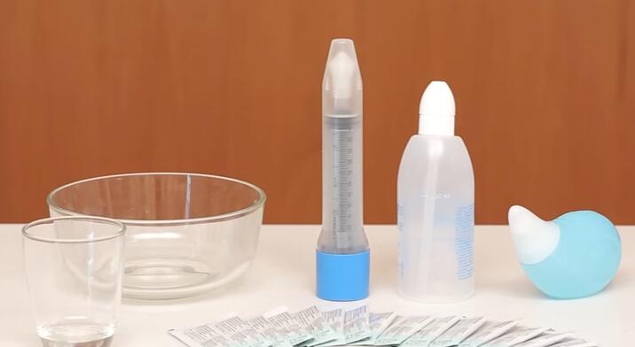 在清洗鼻子时使用的工具包括0.9%的盐水、注射器、盛放未使用的盐水的碗/杯子、盛放已使用的盐水的碗/杯子。