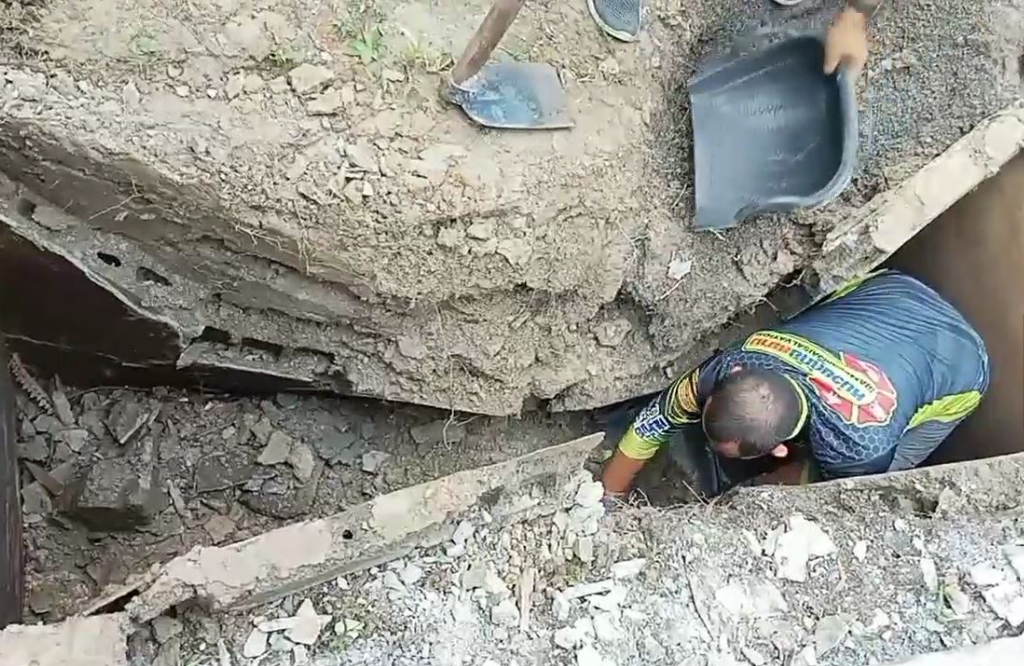 จึงได้ประสานมาทางมูลนิธิสยามรวมใจปู่อินทร์ อ.ร่อนพิบูลย์ ให้ช่วยไปขุดนำร่าง ผู้เสียชีวิตขึ้นมาในวันที่ 3 ส.ค. เวลา 09.00 น. จากนั้นนายธัญวัฒน์ เพชรสุวรรณ หัวหน้ากู้ภัยสมาคมสยามรวมใจปู่อินทร์ อ.ร่อนพิบูลย์ จ.นครศรีธรรมราช นำกำลังอาสาสมัครไปทำพิธีขอขมา และร่วมกันขุดนำร่างผู้เสียชีวิตขึ้นมาจากหลุม เมื่อเปิดหลุมพบว่ามีคอนกรีตที่พังทับร่างของผู้ตายอยู่จริงๆ